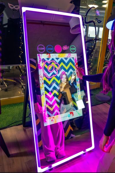 Meet the showstopper of photo booths! The Mirror Air Booth isn’t just a booth—it’s a giant, glowing mirror packed with interactive fun. Guests can touch the mirror, sign their photos, add emojis, and enjoy playful animations that make every snap an experience.